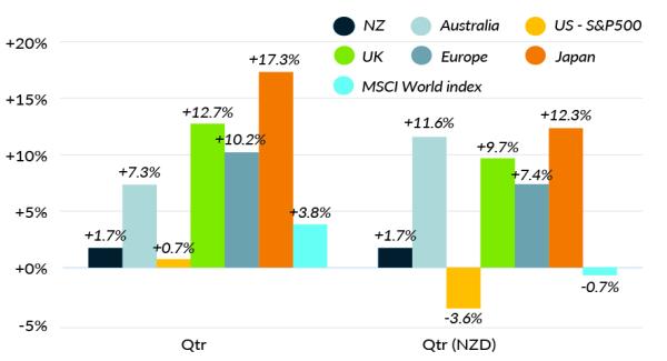 - Fixed income returns were solid. NZ investment-grade corporate bonds gained +1.2% for the quarter; 12-month returns were +6%.