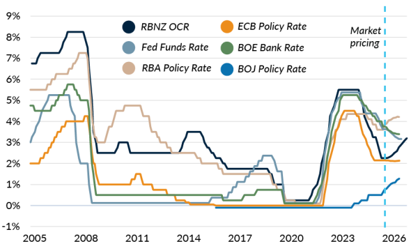 At the end of last year, the RBNZ cut the Official Cash Rate (OCR) by a further -25bp in November, taking it to 2.25%. Barring any major economic shocks, this is widely expected to mark the final rate cut of the current cycle. After several challenging years, the NZ economy shifted into recovery mode in the second half of 2025. There are increasing signs this momentum will carry through into 2026. Economic activity is picking up across a range of regions and sectors. Business and consumer confidence have improved, retail spending is gaining traction, and the labour market is beginning to stabilise.