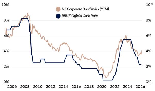 NZ corporate bond index (yield-to-maturity) and RBNZ official cash rate
